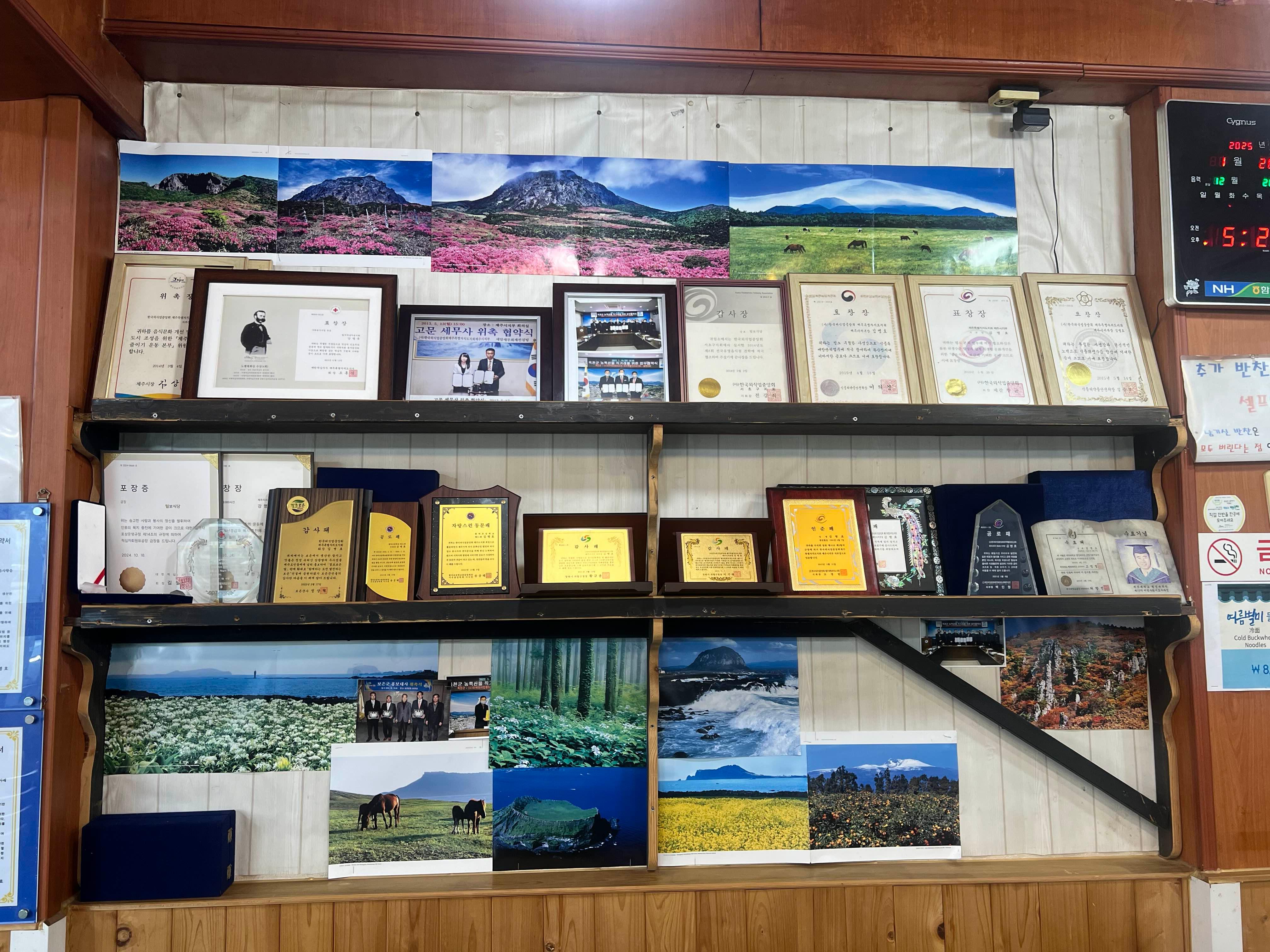 털보 김병효 사장님은 함덕초등학교 31회 출신이다. 어느 때 가보니 털보식당 앞에 함덕초 31회 동창회 간판이 붙어 있어서 알게 되었다. 1937년 함덕초가 생겼으니 아마도 68년 졸업했으니 일흔이 아직 안되셨다. 요식업중앙회 함덕지부장도 역임하셨다. 그 외에도 함덕에 터줏대감임을 알 수 있는 여러 상장과 표창장들이 음식점의 벽 하나를 채우고 있다. 음식 맛과 표창장은 비례한다. 일단 표창장이 많다는 것은 한 자리에서 오래 자리잡은 음식점이고 그 자리에서 단골이 그만큼 많다는 뜻이기도 하다.